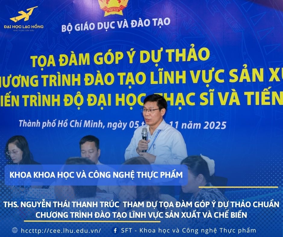 Tham dự buổi tọa đàm có PGS.TS. Nguyễn Anh Dũng – Phó Vụ trưởng Vụ Giáo dục Đại học, GS.TS. Trang Sĩ Trung, Chủ tịch Hội đồng thẩm định Chuẩn chương trình đào tạo, cùng lãnh đạo, chuyên gia và đại diện hơn 60 cơ sở giáo dục đại học trên cả nước. Đại diện Trường Đại học Lạc Hồng, ThS. Nguyễn Thái Thanh Trúc, Trưởng bộ môn Công nghệ thực phẩm, Khoa Khoa học và Công nghệ Thực phẩm đã tham dự và đóng góp ý kiến về chuyên môn.