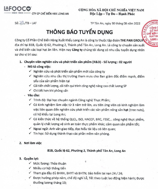 Công ty LaFooCo tuyển dụng chuyên viên R&D
