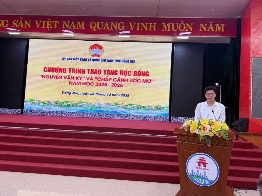 Sáng ngày 28/12/2025, tại Hội trường Đảng ủy phường Trấn Biên, Ban Thường trực Ủy ban Mặt trận Tổ quốc Việt Nam tỉnh Đồng Nai phối hợp nhà tài trợ tổ chức chương trình trao tặng học bổng “Nguyễn Văn Ký” và “Chắp cánh ước mơ” năm học 2025-2026 cho 150 em học sinh, sinh viên thuộc hộ nghèo, hộ có hoàn cảnh khó khăn và các em là con, cháu, chắt trực hệ của Bà mẹ Việt Nam anh hùng, liệt sĩ vượt khó học giỏi.