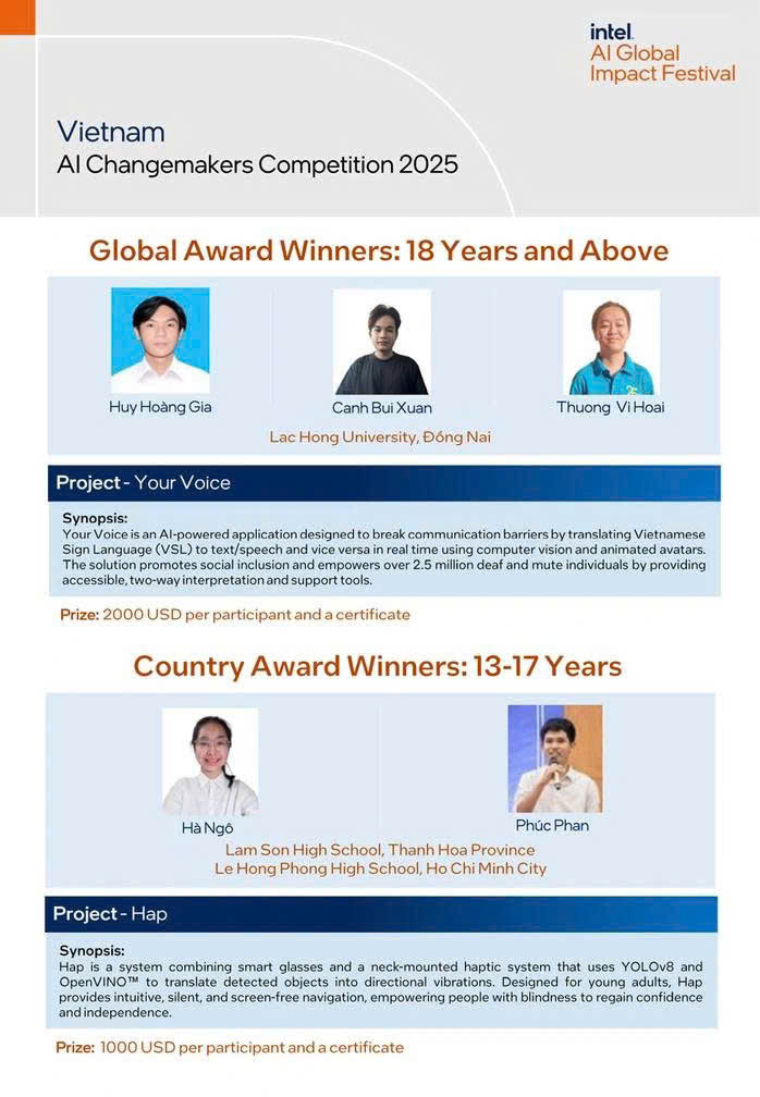 • Điểm nhấn quốc tế: Trong bối cảnh toàn cầu đang thúc đẩy AI vì cộng đồng (AI for Good) và truy vấn về đạo đức AI, Your Voice đáp ứng cả hai: tạo ra tác động xã hội ở mức quốc gia và thực hiện các yêu cầu về triển khai AI có trách nhiệm – một trong ba tiêu chí đánh giá cao nhất của Intel.