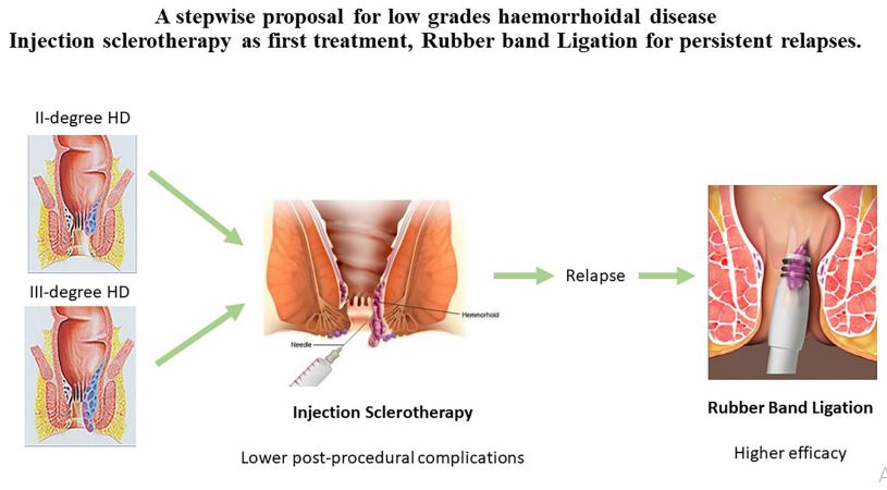 3. Tutino R, et al. A stepwise proposal for low-grade hemorrhoidal disease: injection sclerotherapy as a first-line treatment and rubber band ligation for persistent relapses. Front Surg. 2022;8:782800.